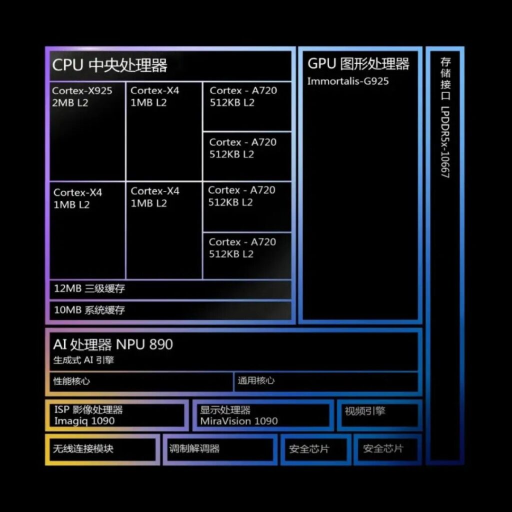 La arquitectura es de 64 bits; además de los 8 núcleos que tiene en su interior. De los cuales 2 son Cortex-X925 corriendo a 3.36GHz.
